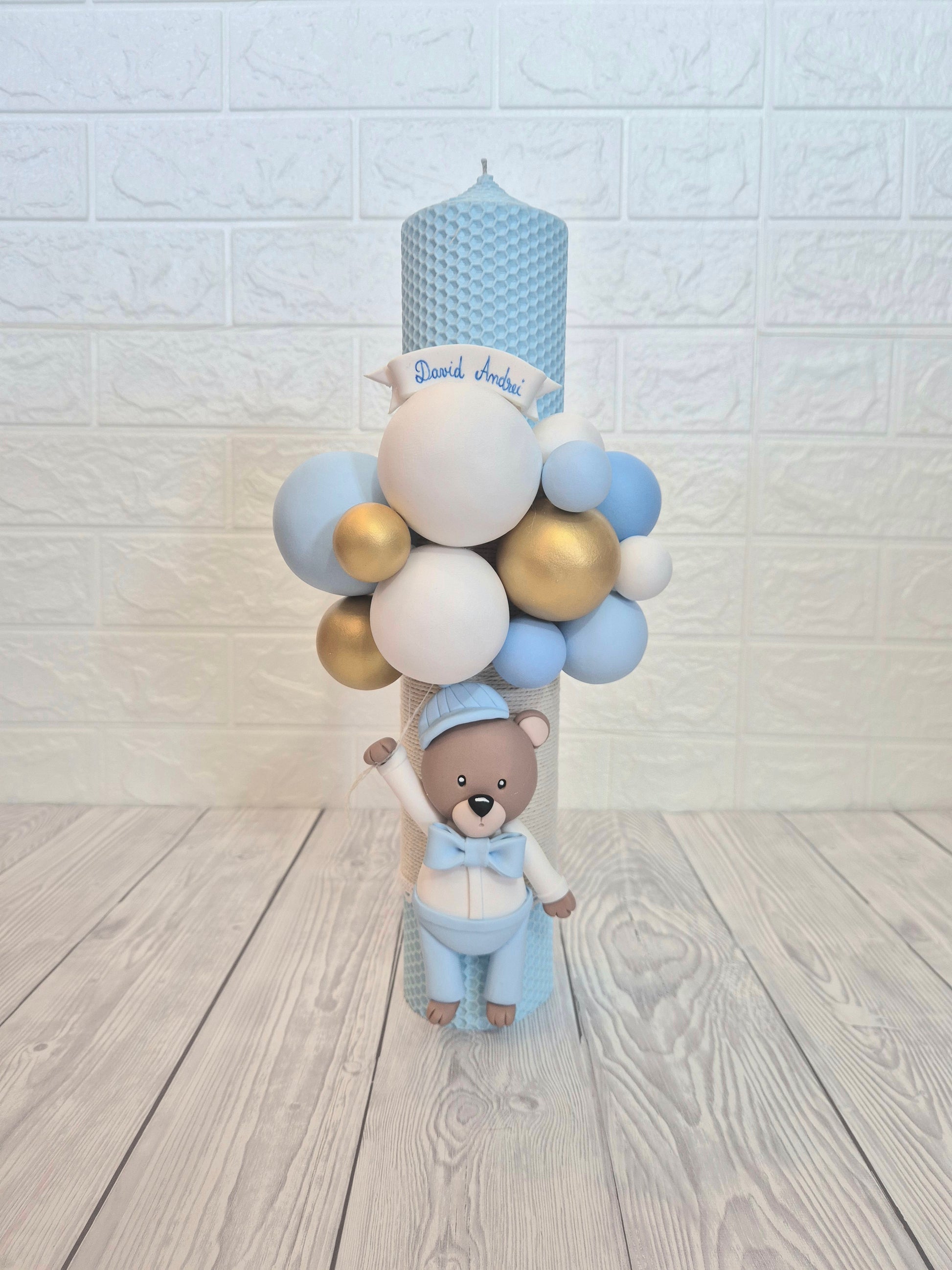 Lumanare de botez din ceara naturala, bleu, Ursulet cu Bascuta